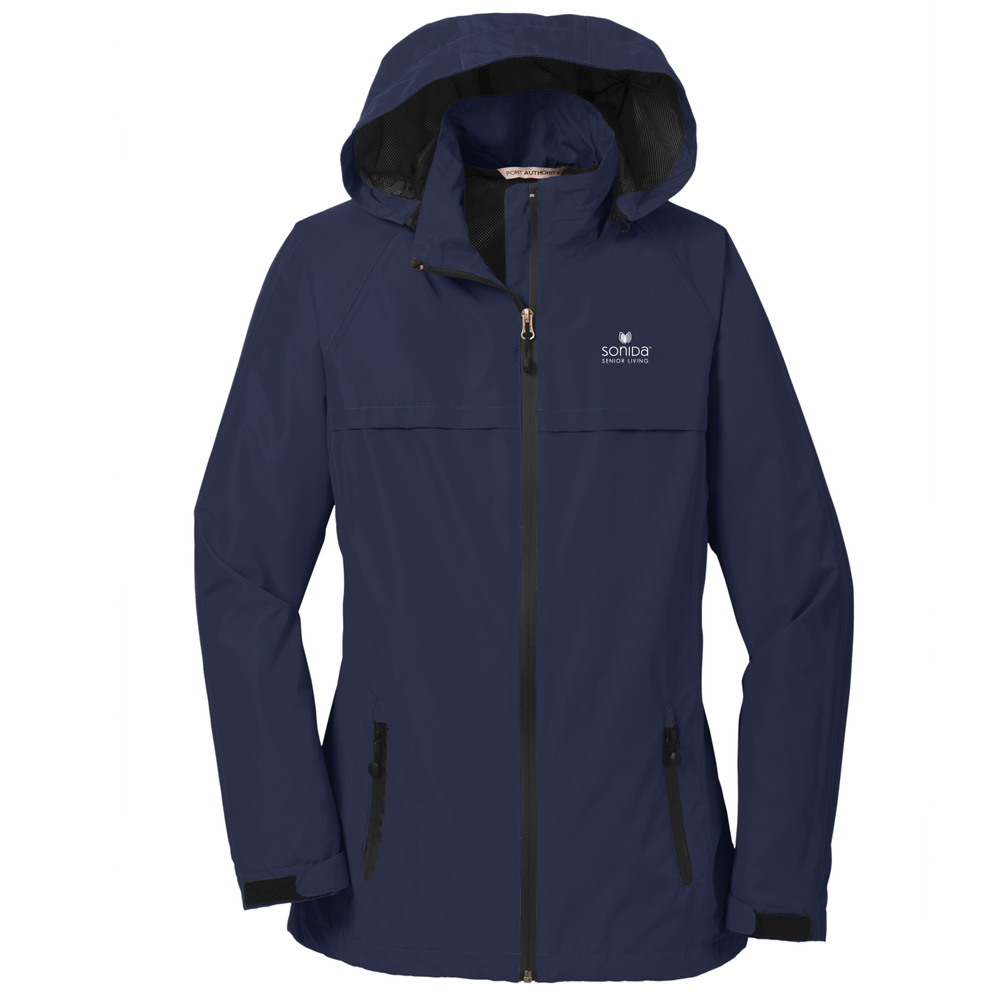 Our versatile, fully seam-sealed jacket offers outstanding waterproof protection to keep you dry whether you're on the job or on the trail. Folds into a convenient carry pouch for easy, compact storage. Made of 100% polyester with mesh-lined body and hood. It has a 5000MM fabric waterproof rating, and it has a 3000G/M2 fabric breathability rating. It features a zip-off hood, contrast waterproof zippers, adjustable self-fabric tab cuffs with hook and loop closures, front zippered pockets, Port Pocket for decoration access, open hem with locking drawcord for adjustability, and drawstring carry pouch included.