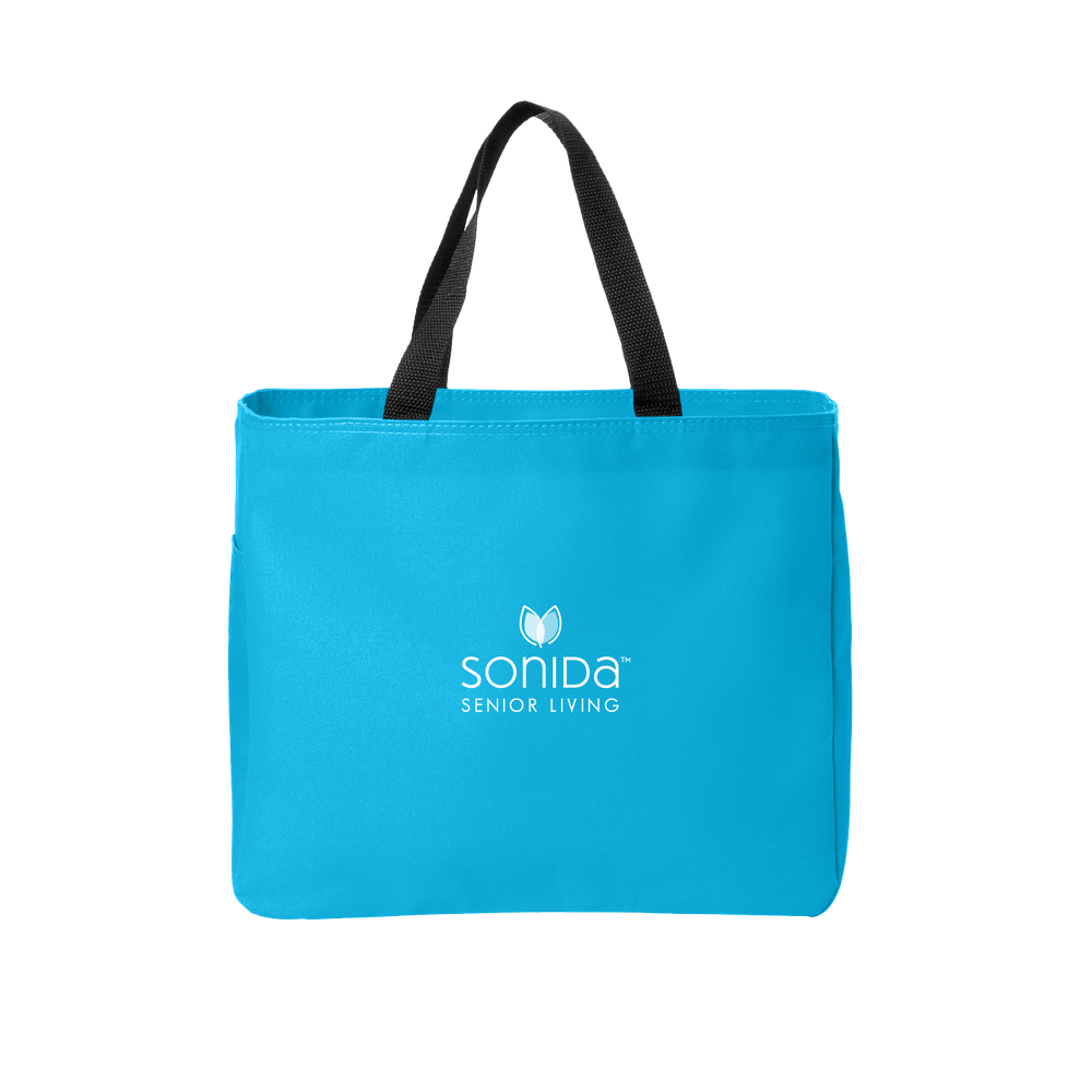 This durable tote is a tremedous value. It is made of 600 denier polyester canvas. It has a large main section with small interior self-fabric pockets, an exterior side pocket, and web handles. Dimensions: 12" h x 12" w x 6.5" d